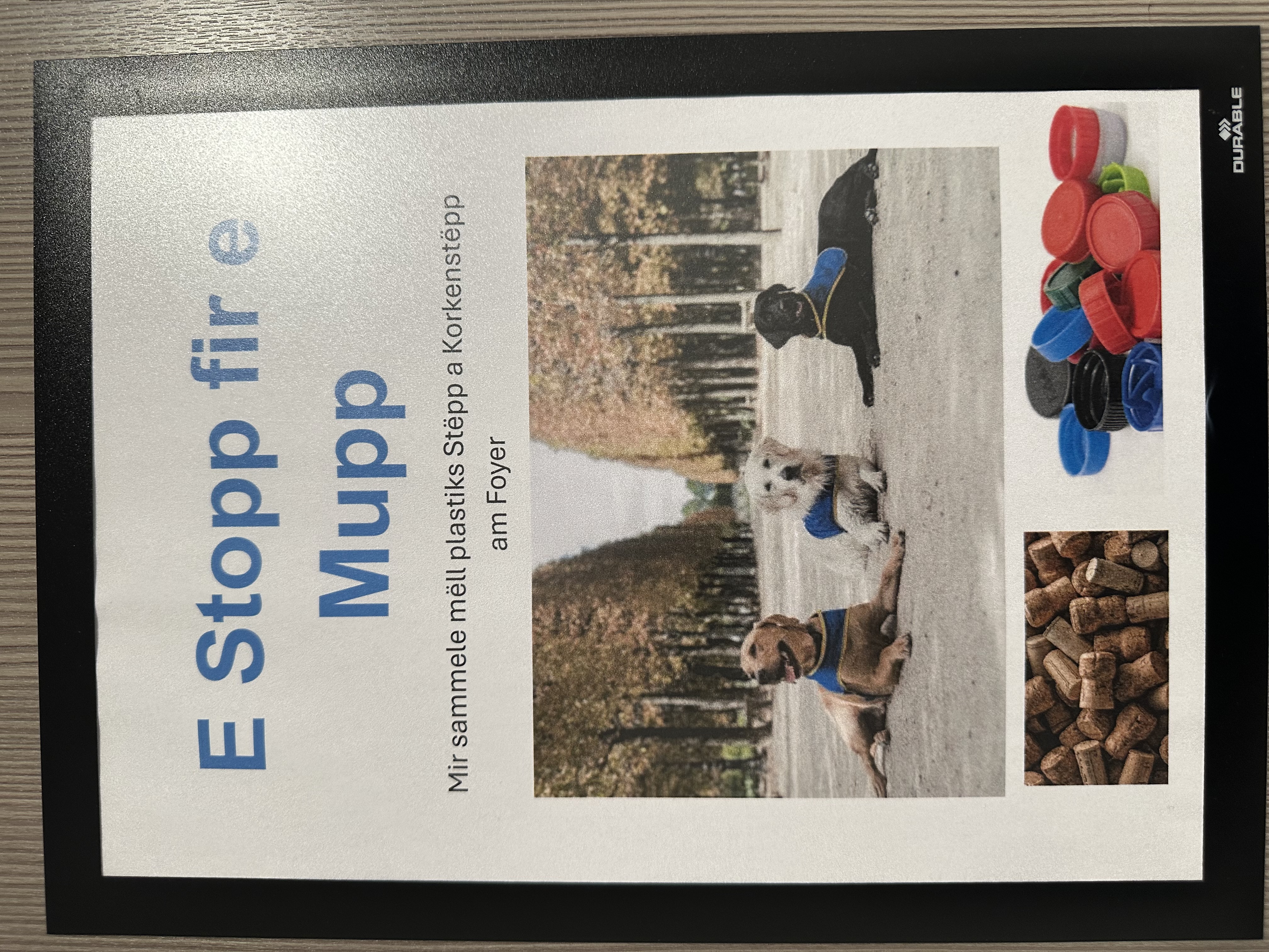 Mir sammele mëll Plastiks- a Korkestëpp fir Assistenzhënn ze parrainéieren a fir d'Ëmwelt ze schounen duerch de Recyclage. Jiddweree kann hëllefen!